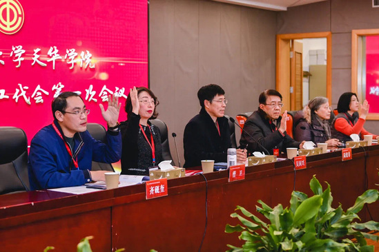 经过全体代表投票选举,王茜、包静波、朱博、吴国兴、周建文、徐娟、曹卫、答英娟、韩聪颖当选为第三届工会委员,赵科、徐振、戚春兰当选为第三届经费审查委员会委员。大会通过王晓兰、孙连荣、杨央、周丽婕、胡雅楠、夏智源、曹卫、谢京茹、戴沉雁为第三届工会女职工委员会委员。经过全体代表投票表决,通过了《天华学院工作报告》、《天华学院第二届工会委员会工作报告》和《关于天华学院转设工作方案的报告》。