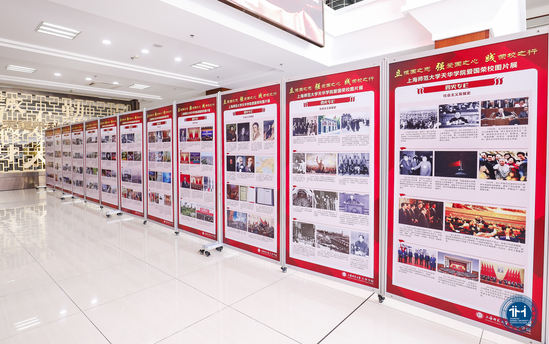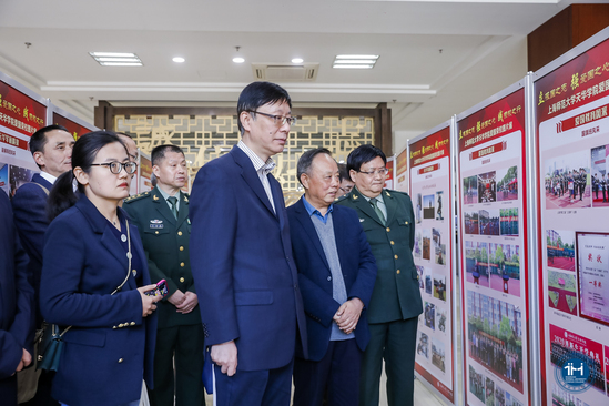 (与会人员参观“爱国荣校”主题图片展)