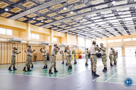 推进会上,与会领导一行观摩了学校“爱国荣校”主题图片展,现场观看了在体育馆举行的学校国防教育军训成果团体项目展示。学校在国防教育工作中将课堂理论授课与军事技能实战训练并举,创新开展常态化军训 + 集中军训模式,厚植爱国情怀,激发崇军尚武精神。 学校着重培养“在校男生人人会打军体拳,女生人人会打功夫扇”,提正学生阳刚气,传承优秀传统。强化国旗班建设充分发挥退役学子自治育人特色。活动现场全方位、多维度展现了活力天华的育人举措。