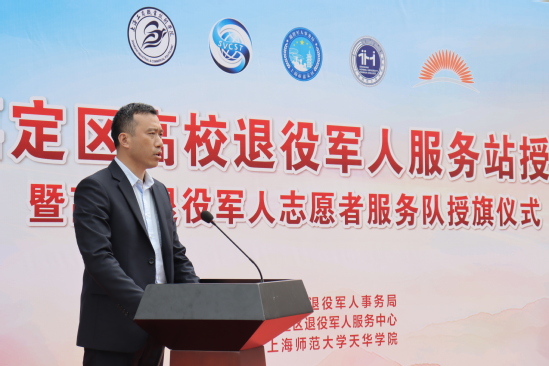 嘉定区退役军人事务局党组成员、副局长刘权为四所高校思想政治工作教导员颁发聘书,并向四所学校役军人志愿者服务队授旗。