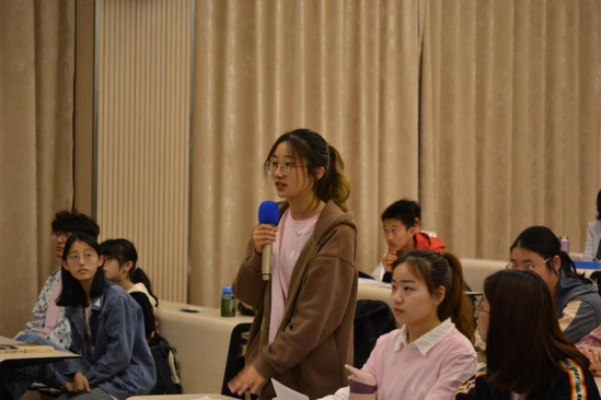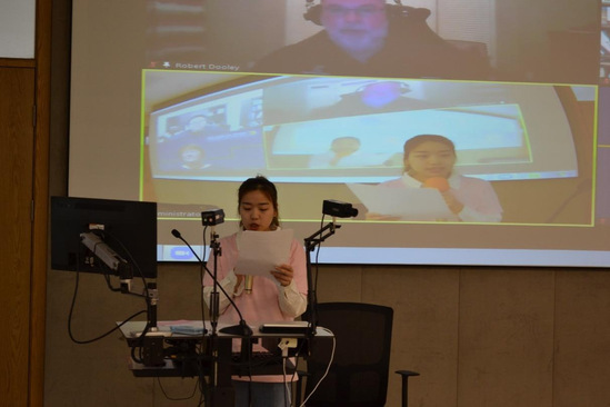2020级国际商务(国际课程合作)专业学生代表桂书萍用英语向外方教师们介绍了自己入校以来的感悟,她表示在过去的半年中,虽然课程非常忙碌,但是收获颇丰,学习能力和工作能力均得到了很大提高。她认为国际课程合作专业为同学们提供了更多更好的机会,尽力付出努力才能抓住机会,身边很多同学都希望未来能有机会赴田纳西大学攻读双学位。