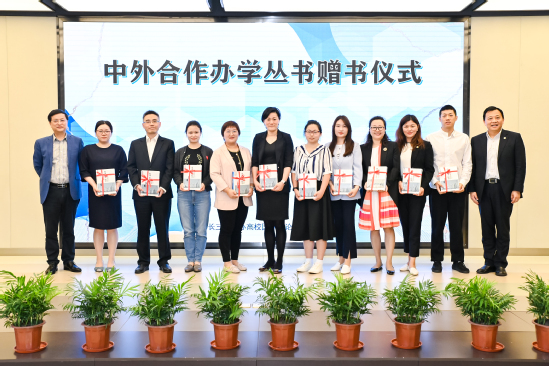 论坛中,上海市教育评估协会跨境教育专业委员会主任、上海工程技术大学副校长史健勇与上海市教育评估院教育综合事务评估所所长汪建华共同为与会学校代表赠送中外合作办学系列丛书。