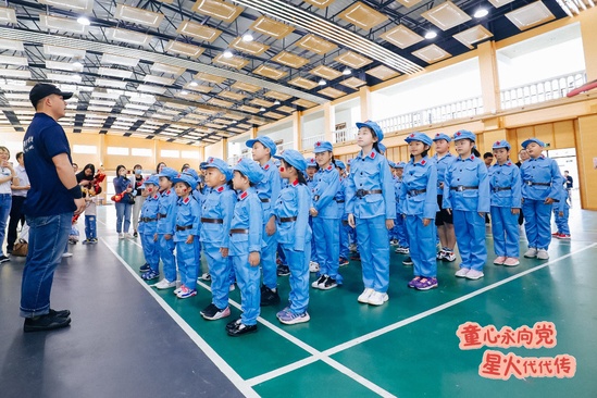 “军号嘹亮”环节,让参加的小朋友穿上小红军军装,完成集合整队及活动热身运动。