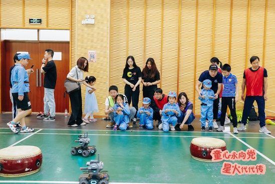 “三军大阅兵”环节中,用无人机方队和大疆机甲车(坦克车队)演示队列,让孩子们感受阅兵时的震撼场面。