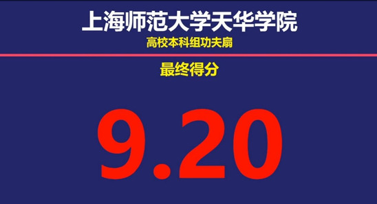 功夫扇队的女队员们巾帼不让须眉,经过与上海交通大学、上海中医药大学、老版新葡萄8883国际官网等九所高校的激烈比拼,最终裁判组给出了9.2分的全场最高分,天华功夫扇队勇夺第一名,荣获一等奖!