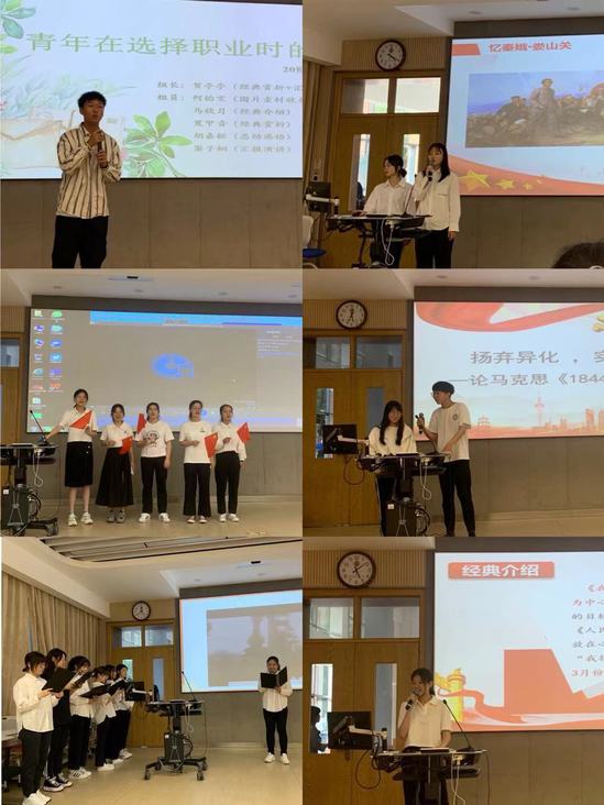 6月15日,经过层层选拔之后,6组优秀作品最终进入决赛。本次决赛邀请马院副院长丁彩霞莅临指导,马院教研室主任华芸、牛风学、贾孟云、张纤纤担任评委,黄播担任主持人。决赛采用PPT汇报讲解形式进行,汇报内容分为4个部分,即经典介绍、经典诵读、经典赏析、总结感悟,每组汇报时间为15分钟。经过激烈的角逐,19小学教育2班李香小组作品《我将无我,不负人民》与19中美心理2班石皓田小组作品《1844年哲学经济学手稿》获得一等奖;20小学教育2班滕智懿小组作品《信仰的味道》与19学前(中本)1班邵子桢小组作品《湖南农民运动考察报告》获得二等奖; 19学前教育1班叶佳琪小组作品《中国复兴之路》与20财务管理1班窦子桐小组作品《青年在选择职业时的思考》获得三等奖。