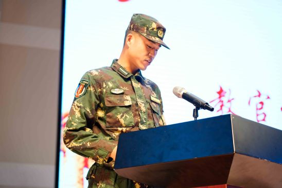 承训教官何忠冲,代表全体教官进行发言。他指出军训是大学生的必修课,是提升个人素质修养、提高思想境界最有效的方法。希望同学们在本次军训中提高思想认识,找准军训站位,培养团队协作意识,增强连、排凝聚力。同时代表全体教官表决心,在军训过程中做到严格履行教官职责,认真组训、科学施训。