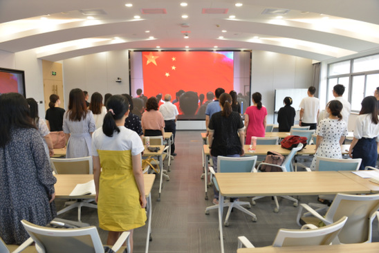 同时,9月10日上午,新教师积极参加了2021年上海市新教师入师入会仪式的现场直播,校长叶才福,副校长、人事处处长吴国兴,人事处常务副处长曹卫也出席了活动。当屏幕上出现鲜红的五星红旗,室内响起洪亮的国歌声时,校领导和全体新教师纷纷起立奏唱国歌。