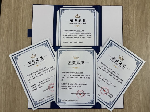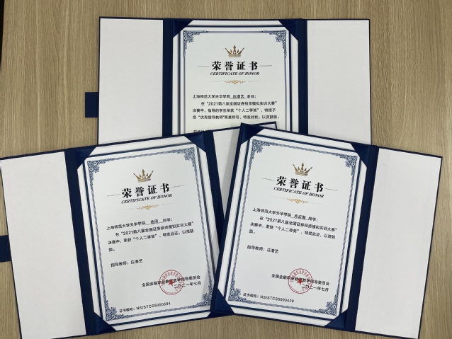 在本次比赛中,三位同学在专业指导教师庄潜艺的带领下频频出线,获得了市场交易组决赛团队一等奖和个人二等奖的优异成绩。