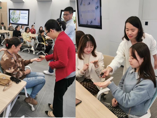 活动现场,老师们依次体验不同精油对身体产生的妙处,比如野橘精油的浓郁水果香味,具有激励与提升的作用,薄荷精油给人带来清凉和提神的感受,并有舒缓身心的独特疗效,而玫瑰精油可舒缓情绪、滋养皮肤,对老化皮肤有极佳的修护作用。