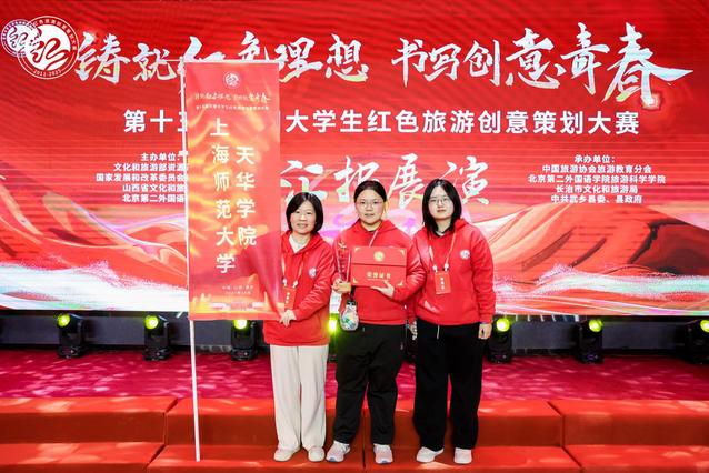 我校勇夺全国大学生红色旅游创意策划大赛一等奖2025年10月18日至21日,第十五届全国大学生红色旅游创意策划大赛全国总决赛在山西武乡举行。作为国内规模最大、入选教育部“高校思政工作精品项目”的全国性旅游类专业竞赛,本届大赛以“铸就红色理想,书写创意青春”为主题,聚焦纪念抗战胜利80周年,由文化和旅游部资源开发司、国家发展和改革委员会社会发展司等单位联合主办。(文化和旅游部资源开发司司长满宏卫致辞) 大赛共设红色旅游线路设计、旅游营销策划、文创产品设计等六大赛道,共吸引全国1001所高校、6002支团队、逾3万名师生参与,征集作品达5144项,最终各赛道全国十强共60支团队晋级总决赛;评审环节首次采用“AI技术+人工复核”双轨审核机制,从政治性、真实性、规范性与创新性等维度对作品进行全面评估,展现技术赋能红色文化传播的新趋势。(夏雨欣团队(右四)获奖照片) 大赛中,由我校商学院旅游管理专业学生夏雨欣组队,其同班同学王欣余与上海理工大学学生李声洋为成员的参赛团队,在商学院陈素霞老师与艺术设计学院殷心悦老师悉心指导下,经过多轮激烈角逐,从众多优秀队伍中脱颖而出,荣获全国一等奖,实现我校在该项高水平赛事中的历史性突破。(指导教师陈素2025-10-24 -