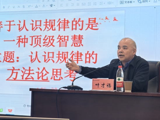 校长讲思政课 | 叶才福校长做“认识规律的方法论思考”专题报告为深入学习贯彻习近平新时代中国特色社会主义思想与党的二十大精神,促进马克思主义的世界观与方法论在青年学子中落地生根,2023年11月16日下午,马克思主义学院特邀叶才福校长为师生做“认识规律的方法论思考”的专题报告。本次报告在晖华楼报告厅举行,商学院党总支书记智瑀主持,马克思主义学院思政课教师与商学院近300名学生共同参加了本场报告。(叶才福校长做专题报告)叶校长以“乌卡(VUCA)时代”作为引入,指明当今时代的易变性(volatility)、不确定性(uncertainty)、复杂性(complexity)与模糊性(ambiguity)。立足于世界百年未有之大变局与中华民族伟大复兴战略全局,只有坚持马克思主义的基本立场、观点和方法,在把握事物发展客观规律的基础上充分发挥自身的主观能动性,才能回答历史之问、时代之问与未来之问,融入当前快速发展与变化的时代。叶校长抛出“何者是规律”的问题激发同学们思考,随后逐一阐述了规律的客观性、普遍性、稳定性、重复性、节奏性五大特征,并详细讲解了规律的本质和内涵,让师生对规律有了更加清晰的认知。叶校长结合中国共产党一百多年的发展历程,指出了善于认识规律2023-11-20