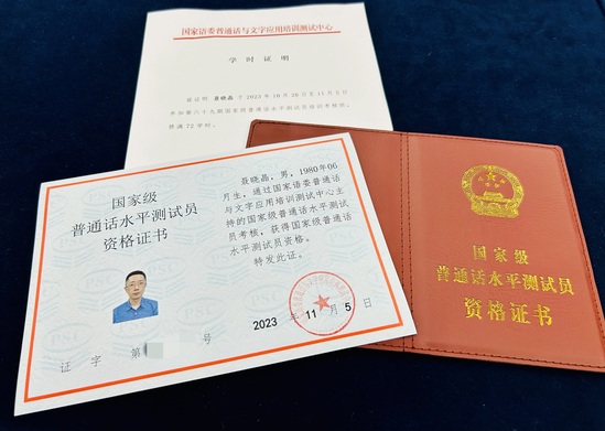 我校通识学院教师获国家级普通话水平测试员资格1111MicrosoftInternetExplorer402DocumentNotSpecified7.8 磅Normal0近日,经上海市语委选拔推荐,我校通识学院副院长聂晓晶于10月26日-11月5日在北京参加了由国家语委普通话与文字应用培训测试中心举办的第六十九期“国家级普通话水平测试员资格考核培训班”。经过紧张的培训和严格的考核,聂晓晶三项科目全部合格,顺利获得国家级普通话水平测试员证书,是本批上海市选送的学员中唯一获此资格者。此次培训共有120名学员参加,分别来自32个省、市、自治区及新疆建设兵团。十天的学习分为培训和考核两部分,培训主要包括普通话水平测试概论、普通话词汇语法专题、评分标准解析、测试实例讲解、测试能力训练等内容;考核涵盖了汉语拼音测验、普通话水平测试、测评能力考核等。普通话水平测试员作为测试工作的具体承担者,分为国家级测试员和省级测试员。据悉,目前上海仅有60名左右国家级测试员,分布在市、区级语言文字从业人员、普教及高校教师中,若仅以高校计算,沪上每所院校在职的“国测员”不足1人。拥有“国测员”,从一个侧面印证了所在高校语言文字工作的品质。书同文,语同音,人2023-11-06 -