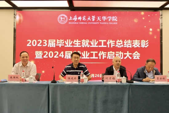 学校举行2023届毕业生就业工作总结表彰暨2024届毕业生就业工作推进会1111MicrosoftInternetExplorer402DocumentNotSpecified7.8 磅Normal010月26日下午,学校在图书馆四楼报告厅举行2023届毕业生就业工作总结表彰暨2024届毕业生就业工作推进会。党委书记陆建非、校长叶才福、党委副书记曹云林、副校长朱国权等领导出席会议。参加会议的还有各二级学院院长、党总支书记、相关职能部门负责人、以及2023届、2024届毕业生辅导员。就业指导中心副主任吴莺主持会议。朱国权首先作天华学院2023届毕业生就业工作总结汇报。报告主要从2023届毕业生就业所取得的成绩、遇到的就业困境、主要采取的工作措施和对下一届毕业生就业情况的思考与展望展开。报告以具体数据的形式通报了全校就业率以及各二级学院的就业率。朱国权表示,在疫情与经济的双重压力下,2023届毕业生需要克服高校毕业生人数屡创新高、就业岗位有效提供减弱、毕业生就业内因发生转变等困难,学校采取了一系列有效措施,确保毕业生就业工作的顺利推进,实现了就业去向广阔多元,就业质量不断提升,考研留学成绩突出的佳绩。面对已经开始的新一届毕业生就业工作,朱国权提出了下一步工作的2023-10-27 -