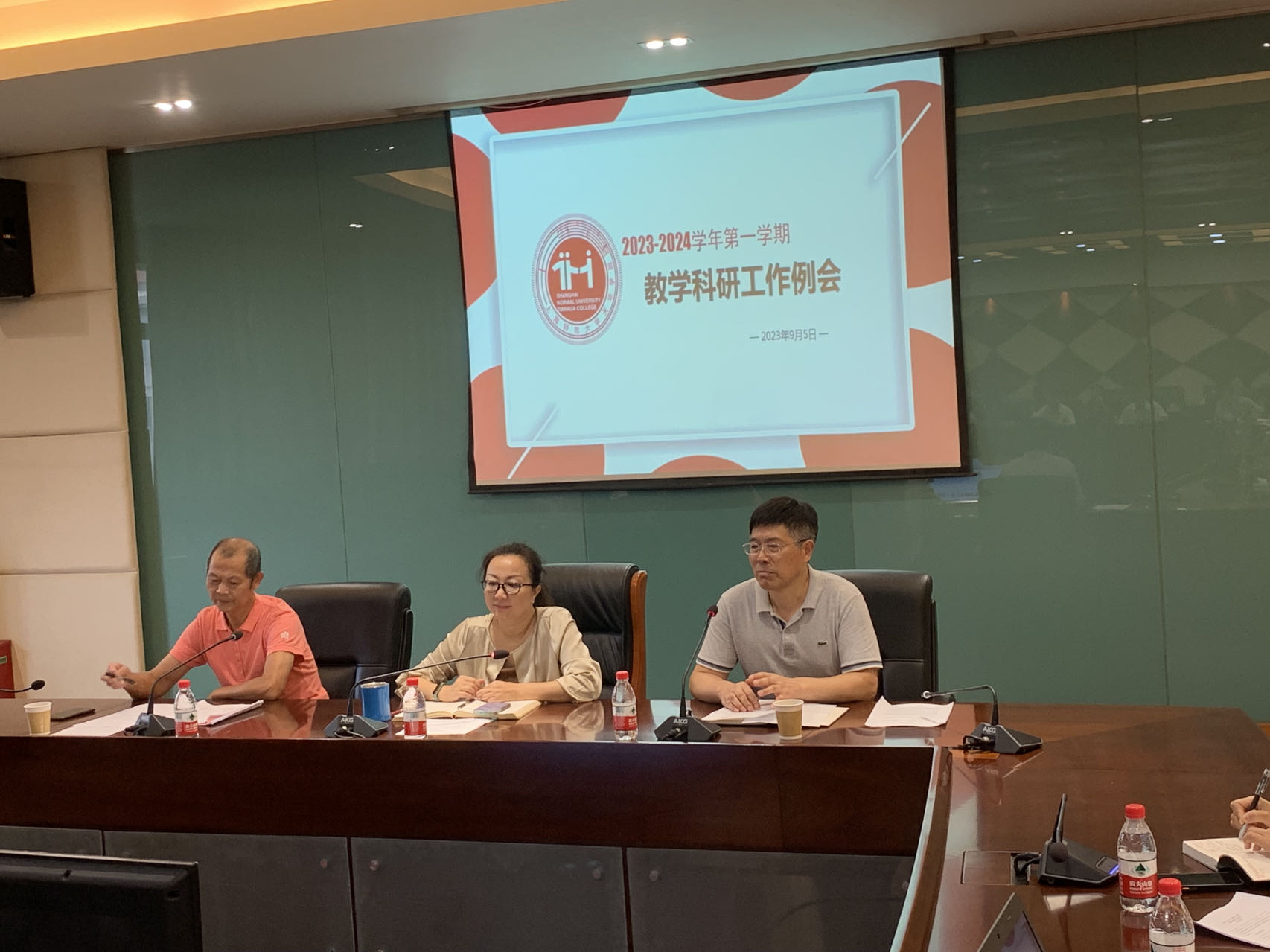 我校教学科研部门召开新学期工作会议今年是我校迎接转设评估的关键之年,为深入贯彻董事会年度工作纲要提出的“七个持续推进”总方针,全力落实校行政“抓攻坚、固根本、求突破”三大要求,9月5日,我校教学科研部门召开新学期工作会议,副校长龚春蕾、陈新斌、吴国兴,各二级学院正副院长、院长助理,教务处、国际交流处、质量管理处、科研处和实习实训处部门负责人出席了此次会议。(学校领导解读教学科研重点工作)副校长吴国兴提出师德师风是评价教师队伍素质的第一标准,全体教职工要将教育部《新时代高校教师职业行为十项准则》落实到教育教学的具体工作中,本学期学校将通过举办师德师风专题竞赛、讲坛等活动,重点推进全校教职工的师德师风建设;在教师教学发展方面,将继续通过举办校级教师教学技能比赛,在新一轮上海高校青年教师教学竞赛、教师教学创新大赛等市级教学比赛上再创佳绩。副校长陈新斌指出本学期学校将设立校级孵化项目,推动打造优秀教学科研团队,加大高水平专任指导教授的引领和指导作用,对专业硕士点培育要求,在高质量、高水平科研成果产出、专利申报和科研成果转化等方面实现突破性的进展;在质量保障方面,质量管理处将和各二级学院和相关职能部门做好质量保障与测评文本(第六2023-09-06 -