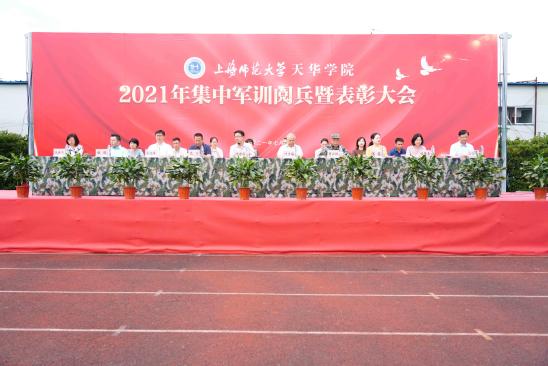 队列汇演展风采 雄姿英发致青春——2021年集中军训阅兵暨表彰大会顺利举行7月8日上午,在庄严升国旗奏国歌仪式中,天华学院2021年集中军训阅兵暨表彰大会于大操场拉开帷幕。校党委书记、军训团政委陆建非,校长、军训团团长叶才福,校党委副书记、学保处处长、军训团副团长曹云林等各二级学院院长、党总支书记出席本次大会。大会由校党委副书记曹云林主持。(校领导出席本次集中军训阅兵暨表彰大会) 大会伊始,三名教官迈着整齐的步伐,手持校旗昂首而来,昂扬的姿态展现出了军人特有的风姿,给全体参训学生起到了良好的带头作用。校旗是学校的标志,是全校师生员工凝聚力的昭示,伴着这面旗帜,天华学院已走过了十六年的风风雨雨,在校旗的带领下,天华师生们将创造更多优异的成绩。(迎校旗仪式) 随后,叶才福校长在曹云林书记的陪同下共同检阅军训方队,并向受阅方队致以亲切的问候。走在最前面方队的是参加上海市教委组织的“九一八阅兵”方队,方队由七个二级学院推选的68名优秀学生代表组成。他们昂首挺胸,步履整齐,英姿飒爽,散发着昂扬的斗志和青春的活力。(校长叶才福在党委副书记曹云林的陪同下共同检阅军训方队) 随后接受检阅的是由2020级学生组成的军训受阅方队。各排同学迈着整齐的步伐,喊着响亮的口号2021-07-08 -