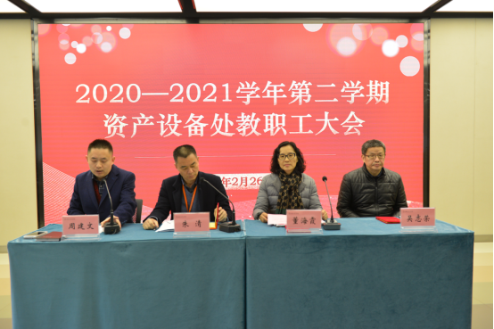 我校资产设备处条线召开新学期教职工大会2021年2月26日下午13:00,资产设备处在图书馆报告厅召开新学期教职工大会,资产设备处处长朱清,副处长董海霞、周建文,图书馆馆长吴志荣,资产设备处全体教职工出席了大会。大会由资产设备处副处长周建文主持。(资产设备处新学期教职工大会)会议首先由周建文副处长对出席会议的人员进行点名考勤;董海霞副处长宣读了《2020—2021学年第一学期资产设备处“服务标兵”表彰决定》;现场组织颁奖。(资产设备处“服务标兵”颁奖)朱清处长对资产设备处新学期工作进行了全面部署,概括起来为“聚焦十项重点工作,巩固三项日常管理”。“十项重点工作”:第一项,扎实做好教学场所室内设施修缮三期项目建设;第二项,高标准做好智能化幼教基地的布局规划、装修设计与装修实施筹备等工作;第三项,主动做好各类政府专项所涉及的硬装建设;第四项,做好校园快递站的搬迁建设;第五项,开发并上线运行两个基于钉钉的服务平台,切实提升保障服务的信息化水平;第六项,对资产设备管理系统进行开发升级;第七项,做好教学区各类用房清查盘点工作;第八项,做好学前教育历史展示馆建设;第九项,做好学校转设资产硬件达标要求相关工作;第十项,做好重点场所等设施2021-03-01 -