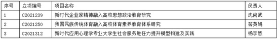 我校3名教师获2021年“上海市教育科学研究”项目立项根据《上海市教育委员会关于公布2021年度上海市教育科学研究项目的通知》(沪教委科【2020】39号),我校3个项目成功获得上海市教育科学研究一般项目立项。具体名单如下:序号立项编号项目名称负责人1C2021239新时代企业家精神融入高校思想政治教育研究沈尚武2C2021250我国民族传统体育融入高校体育素养教育体系研究答英娟3C2021312新时代应用心理学专业大学生社会服务胜任力提升模型构建及实践杨宇然“上海市教育科学研究”项目是由上海市教育委员会设立、出资和实施管理,限各级各类教育工作者、教育管理工作者和科研院所的科研人员申报的项目。旨在坚持“理论与实践相结合”的原则,解决教育改革与发展中理论问题和实践问题,推动教育科研与教学的深度融合。此项目限额申报,评审严格,根据《上海市教育委员会关于组织申报2021年度上海市教育科学研究项目的通知》(沪教委科〔2020〕23号文),经专家评议、上海市教育科学规划领导小组审定、网上公示,上海市教育科学研究一般项目共立项373项,其中我校3项获得立项。2021-01-20 -