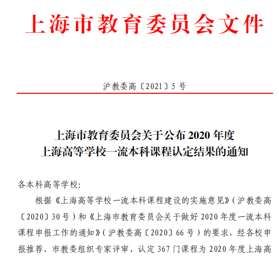 喜讯!我校3门课程入选2020年上海市级一流本科课程认定名单2021年1月,上海市教委公布2020年市级一流本科课程认定结果(沪教委高〔2021〕5号),我校3门课程入选2020年市级一流本科课程,包括2门线下课程,1门线上线下混合式课程(课程名单如下)。上海市级一流本科课程是市教委深入贯彻落实党的十九大精神,全面落实立德树人根本任务,深化教育教学改革的重要举措;也是国家“双万”计划的重要组成部分。市教委计划经过两年左右时间,通过“先建设、重应用、后认定”的方式,建设1000 门左右市级重点课程,认定 600 门左右市级一流课程,构建具有上海特色、多类型、多样化的一流本科课程体系。学校高度重视课程建设和申报工作,成立一流本科课程建设领导小组,制定《老版新葡萄8883国际官网一流本科课程建设规划》,确定了校级活力课堂建设、市级重点课程建设、市级一流本科课程认定、国家级一流本科课程认定的课程建设阶梯。此次市级一流本科课程认定,经过学校的精心组织和各课程负责人的认真准备,在与全市的公办、民办高校同平台竞争中,取得优异成绩。希望3门入选课程,在后续的建设过程中,进一步深化课程改革和创新,优化课程管理和评价机制,注重课程建设的示范引领性和推广性,积极推动我校的2021-01-20 -