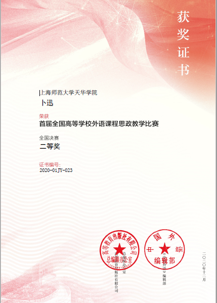初等教育学院教师在“高教社杯”首届全国高校外语课程思政教学比赛中获得佳绩2020年12月19日,高等教育出版社与《中国外语》编辑部共同举办的“首届全国高等学校外语课程思政教学比赛”终于落下帷幕。我校初等教育学院英语专业卜迅老师(个人)和陈慧美、冯恬恬老师(团队)的教学设计经过层层选拔,从1500多项作品中脱颖而出,分获英语专业组二等奖和大学英语组全国二等奖。本次大赛获奖,体现了初等教育学院在推进外语课程思政建设方面的实力。本次比赛旨在使各级各类外语课程与思想政治理论课同向同行,进一步发挥外语课程在立德树人中的积极作用,全面提升高校外语教师课程思政教学能力。作为首届外语思政类教学比赛,大赛吸引了全国众多高等院校教师的参与。经过8月份初赛的选拔,我校参赛作品从1500件作品中脱颖而出。三位老师于11月进入复赛。两个团队反复研讨修改作品,在设计过程中主动落实课程思政理念,从学情分析、教学目标、教学重难点以及价值背景等角度思考实现方法,真正做到了知识传授和价值引领相统一、教书与育人相统一,力求让课堂主渠道育人功能实现最大化,彰显外语课程思政的意义和价值。卜迅老师的参赛作品Beauty Love and Sacrifice着重体现了环境保护在生活中的重要性,通过生动2021-01-04 -