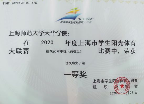 海阔凭鱼跃,天高任鸟飞——校功夫扇再获第一佳绩上海市学生阳光体育大联赛——在线武术拳操功夫扇比赛于2020年10月19日至10月23日举行,我校功夫扇队于10月23日在跃华楼体育馆完成视频参赛,以9.2分获得第一名的佳绩。为取得佳绩,展示天华学院学生的精神风貌,校功夫扇队于2020年9月中旬开始筹备本次比赛。训练采取分组训练和集体训练相结合的方法,除每周日固定的集训以外,各训练小组每天又加时额外训练。在答英娟老师的指导及功夫扇队干事们的努力下,克服训练时间难统一,训练场地有限制等各种问题,在动作细节上下功夫,在团队默契上求突破,充分展现天华学子的精神风貌。10月23日20:00,队员们身穿浅蓝色队服,手持金、红扇,以昂扬的姿态和最饱满的精神面貌顺利完成在线比赛,彰显天华学子积极向上、团结奋进的体育拼搏精神。2020-11-30 -