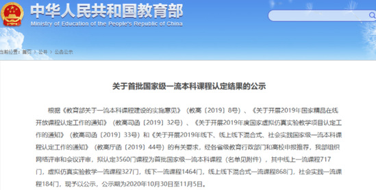 我校《早期阅读与指导》课程入选首批国家级一流本科课程2020年11月,教育部公示了首批国家级一流本科课程认定结果,此次教育部共认定3560门课程(线上一流课程717门,虚拟仿真实验教学一流课程327门,线下一流课程1464门,线上线下混合式一流课程868门,社会实践一流课程184门)为首批国家级一流本科课程。我校学前教育学院滕薇院长及其教学团队(赵琼、扶跃辉、陆凌云、潘晓敏)负责的线下课程《早期阅读与指导》成功入选。这是我校首次获得国家级教学成果!(教育部公示原文)(教育部公示名单截图)一流课程建设是教育部“双万计划”的重要组成部分,2019年教育部启动一流本科课程建设工作,计划经过三年左右的时间,建成万门左右国家级一流本科课程和万门左右省级一流课程。根据《教育部关于一流本科课程建设的实施意见》(教高〔2019〕8号)的有关要求,首批入选的国家级一流本科课程要求质量高、共享范围广、应用效果好、示范性强,并能够代表我国当前本科课程的最高水平。近年来,学校高度重视本科课程建设工作。围绕教育部有关“金课”建设精神,坚持课程是人才培养的核心要素,通过数字化课程、重点课程等各类优质课程培育,推动信息技术与教育教学的深度融合,促进教育教学改革的积极2020-11-17 -