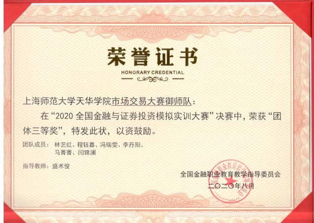 财务管理专业荣获2020全国金融与证券投资模拟实训大赛团体三等奖由全国金融职业教育教学指导委员会主办,深圳希施玛数据科技有限公司承办,中国财经数据创新研究院协办的“2020全国金融与证券投资模拟实训大赛”是全国性大赛,跨度三个多月,分别设市场交易组和投资策略组,共有来自全国556所院校,10660支队伍,合计63960人进行角逐,18届财务管理专业林艺红、程钰嘉、冯瑞雯、李丹阳、马菁菁和闫锦澜六名同学在盛术俊老师的带领下,报名参加了市场交易组,通过激烈的区域选拔赛,决赛两个阶段的比拼,在层层选拔后最终在决赛中脱颖而出获得了团体三等奖的好成绩。(2020年全国金融与证券投资模拟实训大赛三等奖奖状) 全国金融与证券投资模拟实训大赛是以证券业为背景,基于证券从业者所应具备的行业知识、基本业务技能及实操技能等设计的综合实训大赛,大赛分为区域选拔赛、决赛和冠军邀请赛三个阶段,区域选拔赛和决赛采用电脑网络线上操作方式进行比拼,冠军邀请赛采取线下集中场地比赛的形式。 该比赛为学生们提供了一个模拟交易实践的平台,不仅激发了学生的积极性,而且提高了团结合作意识,是十分具有意义的比赛。文|财务管理专业图|财务管理专业供稿|商学院2020-10-22 -
