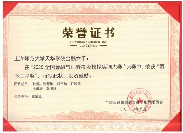 金融数学专业荣获2020全国金融与证券投资模拟实训大赛团体三等奖由全国金融职业教育教学指导委员会主办,深圳希施玛数据科技有限公司承办,中国财经数据创新研究院协办的“2020全国金融与证券投资模拟实训大赛”是全国性大赛,跨度三个多月,分别设市场交易组和投资策略组,共有来自全国556所院校,10660支队伍,合计63960人进行角逐,18届金融数学专业林娜,张慧敏,彭宇灿,许珍珍,金威澎,彭晓晗六名同学在谢富生老师的带领下,报名参加了投资策略组,通过激烈的区域选拔赛,决赛两个阶段的比拼,在层层选拔后最终在决赛中脱颖而出获得了团体三等奖的好成绩。(2020年全国金融与证券投资模拟实训大赛三等奖奖状) 全国金融与证券投资模拟实训大赛是以证券业为背景,基于证券从业者所应具备的行业知识、基本业务技能及实操技能等设计的综合实训大赛,大赛分为区域选拔赛、决赛和冠军邀请赛三个阶段,区域选拔赛和决赛采用电脑网络线上操作方式进行比拼,冠军邀请赛采取线下集中场地比赛的形式。市场交易组和投资策略组分组比赛,投资策略组在决赛阶段鼓励参赛学生使用量化投资工具进行数据分析、策略编写、回测和全自动模拟交易。 金融数学主要是利用数学工具研究金融,像数学建模、数值计算等定量分析方法,2020-10-20 -
