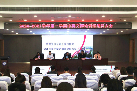 学校顺利开展2020-2021学年第一学期中英文辩论训练动员大会为了落实董事会关于在全校学生中开展中英文辩论的指示精神,在本学期更好的践行“三抓三坚持”特色育人理念,学保处于10月14日上午9:00在晖华楼报告厅召开本学期中英文辩论训练动员大会。校党委副书记、学保处处长曹云林,学保处常务副处长包静波,学保处副处长刘洪伟、邵海波,学保处副处长、校团委书记杨央,以及二级学院党总支正副书记和全体正副辅导员参加了此次动员大会。(图片一、二学保处召开本学期中英文辩论训练动员大会)本次动员大会由学保处副处长刘洪伟主持,大会第一项首先由学保处常务副处长包静波为全体正副辅导员解读《2020-2021学年第一学期中英文辩论训练实施意见》,要求二级学院根据学院特点制定具体辩论训练计划,明确带训辅导员职责,丰富辩论形式,切实加深学生对辩论文化的理解,提升学生对辩论的兴趣。随后,包静波对本学期月度重点工作进行梳理与布置。(图片三学保处常务副处长包静波解读实施意见)为了搭建辩论训练的交流平台,动员大会上邀请了人工智能学院辅导员金玫与艺术设计学院辅导员、校辩论队队长史梦冉交流发言。金玫老师有着丰富的辩论指导经验,她从以往的带训方式与形式转变、辩论中学生成长与感受两个方面向大家2020-10-15 -
