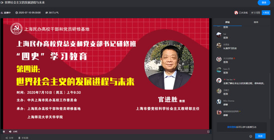 信仰有力量 理想助前行——上海民办高校党总支书记和党支部书记(委员)研修班开展“四史”学习教育云培训之第四讲“社会主义发展史”7月10日,上海民办高校党总支书记和党支部书记(委员)研修班邀请上海市委党校科学社会主义教研部主任官进胜教授讲述“社会主义发展史”,作“世界社会主义的发展进程与未来”的精彩报告,开展“四史”学习教育第四次线上学习,老版新葡萄8883国际官网继续教育学院副院长陈宇飞主持,上海民办高校干部和党员研修基地的学员以及民办高校干部、党员、教师、入党积极分子、青年学生3670人实时在线观看视频直播。官进胜教授从“社会主义从空想到科学的发展”“社会主义从一国到多国的实践”和“社会主义新探索与未来走向”三个方面介绍了世界社会主义发展历史。他介绍了社会主义从空想到实践已经走过500年历史,世界社会主义发展分为六个阶段,即空想社会主义产生和发展、马克思和恩格斯创立科学社会主义理论体系、列宁领导十月革命胜利并实践社会主义、苏联模式逐步形成、新中国成立后我们党对社会主义的探索和实践、我们党作出进行改革开放的历史性决策并开创和发展中国特色社会主义。官进胜教授认为,社会主义从一国到多国的实践过程中,列宁、斯大林的苏联模式到新中国对社会主义的探索和实践,中国开启改革开放的历史性决策带来国家和社会发展的巨大变化,分析中国特色社会主2020-07-10 -