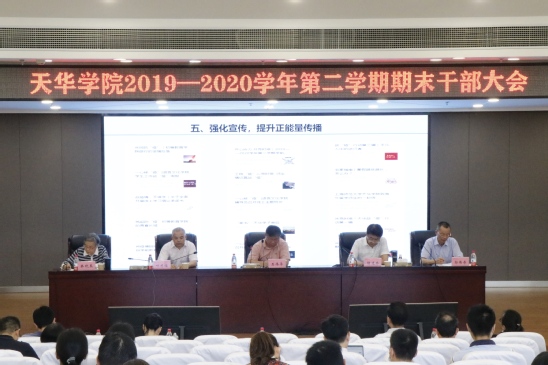 学保处召开2019-2020学年第二学期辅导员工作总结大会2020年7月7日,学保处在晖华楼报告厅召开2019-2020学年第二学期辅导员工作总结大会,就疫情下辅导员的各项工作进行点评与总结。校党委副书记、学保处处长曹云林,学保处常务副处长包静波,学保处副处长刘洪伟、邵海波,学保处副处长兼校团委书记杨央,以及各二级学院党总支正副书记与全体正副辅导员参加会议,此次会议由包静波主持。会上,校党委副书记、学保处处长曹云林就本学期辅导员工作进行了点评与总结。因疫情的影响,本学期非毕业生未能返校,学生工作采取线上线下的实施办法,一手抓疫情的防控,一手抓校园的安全稳定,一手抓非毕业生健康排摸,一手抓毕业生工作。总体上感到疫情防控规范有序,毕业生工作切实有效,绝大部分辅导员工作尽心尽职,校园安全稳定。曹书记指出辅导员工作是做人思想上的工作,在这特殊的一学期中,有相当一部分辅导员表现出了崇高的敬业精神,较好的做好线上线下学生的教育、管理以及疫情的防控工作,为学生排忧解难,时刻以学生为先。年轻辅导员要善于发现自身与优秀辅导员之间的差距,积累工作经验,保持实干精神,敢于实践,提升素养,在政治上保持正确站位,热爱天华的教育事业,顺应天华教育事业的发展潮流,时刻践行2020-07-08 -