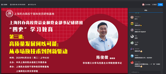 筑梦新时代 争做弄潮人——上海民办高校党总支书记和党支部书记(委员)研修班开展“四史”学习教育云培训之第三讲“改革开放史”6月30日,上海民办高校党总支书记和党支部书记(委员)研修班开展“四史”学习教育第三次线上学习,邀请华东理工大学马克思主义学院党委书记陈俊傲博士、副教授讲述“改革开放史”,作“高质量发展何以可能:从市场换技术到创新驱动”精彩报告,老版新葡萄8883国际官网继续教育学院副院长陈宇飞主持,研修班学员以及民办高校干部、党员、教师、入党积极分子、青年学生6619人实时在线观看直播。陈俊傲从“资源引资本:改革开放发端”“市场换技术:改革开放推进”和“制造升智造:改革开放深化”三个方面讲述改革开放取得的成就。习近平总书记指出,“创新是引领发展的第一动力,科技是战胜困难的有力武器”。我们党和人民长期实践探索形成的科学制度体系:中国特色社会主义制度,就是人类制度史上的伟大创新。陈俊傲介绍我国改革开放过程中,国家从利用资源引入资本开始发展,到第二阶段用市场换取西方技术来推动改革开放,到现在实现制造业升级,改革开放进入全面深化发展阶段。中国特色社会主义进入了新时代,中国经济社会发展也进入了新时代,基本特征就是中国经济已由高速增长阶段转向高质量发展阶段。高质量发展是满足人民日益增长的美好生活需要的发展,也是创新成为主要驱2020-06-30 -