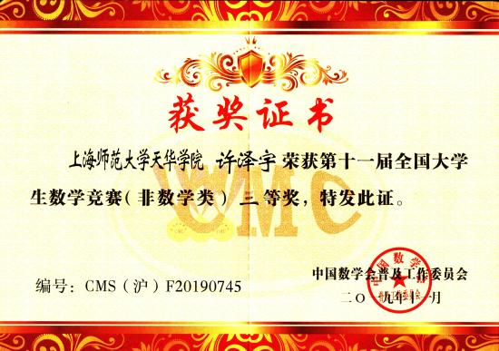 我校学生获得2019年全国大学生数学竞赛三等奖近日,2019年全国大学生数学竞赛上海赛区评审会召开,我校商学院物流管理专业18级2班许泽宇同学荣获全国大学生数学竞赛三等奖暨上海市数学竞赛三等奖。此次大赛获奖,离不开叶才福校长,副校长、通识学院院长龚春蕾等校领导对此项赛事的高度重视、学校相关部门的全力支持以及通识学院数学教学部的精心指导。(获奖证书)为了培养人才﹑服务教学﹑促进高等学校数学课程的改革和建设,激励大学生学习数学的兴趣,培养分析﹑解决问题的能力,发现和选拔数学创新人才,为青年学子提供一个展示基础知识和思维能力的舞台,中国数学会自2009年起2020-01-02 -