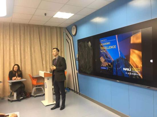 美国北亚利桑那大学来访交流12月11日,美国北亚利桑那大学社会行为科学学院副院长兼心理学系主任LoriMPoloni-Staudinger与国际教育中心副主任BruceWang来访,与2018级英语(教育)专业、2018级学前教育(国际课程合作)专业、2019级应用心理学(国际课程合作)专业学生近距离交流,校长叶才福、校监兼初等教育学院院长史文、健康学院院长祝亚平、国际交流处处长胡珍等热情接待。2018级英语(教育)专业与学前教育(国际课程合作)专业学生即将于2020年8月启程赴美国北亚利桑那大学留学,此次两位外宾专程到访天华学院2019-12-17 -