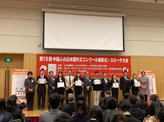 语言文化学院日语专业师生赴京参加第15届中国人日语作文大赛颁奖典礼暨演讲大会2019年12月12日,我校语言文化学院日语专业师生赴北京日本大使馆参加了第15届中国人日语作文大赛颁奖典礼暨演讲大会。全国共有来自208所学校的4359篇作文参赛,大赛共设大使奖1名,一等奖5名、二等奖15名,三等奖60名,佳作奖229名。本届大赛的作文主题有3个:东京2020年奥运会想实现的梦想、年轻人对中日新时代的思考、我的老师/家人/朋友。学生从中选取1个主题进行作文撰写,字数要求在1500-1600字。(颁奖现场)日语专业重视学生的专业能力培养,鼓励学生踊跃报名参加比赛。经校内选拔,2016级、2019-12-13 -