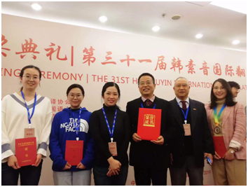 初等教育学院师生赴京参加第三十一届“韩素音国际翻译大赛”颁奖典礼2019年11月9日,第三十一届“韩素音国际翻译大赛”颁奖典礼暨2019中国翻译协会年会于北京世纪金源大酒店隆重举行。本届大赛中我校荣获“最佳组织奖”,初等教育学院三双教师冯恬恬获汉译英二等奖,初等教育学院三双教师隗钟乐、16级小学教育专业学生孔雪儿、王静然获英译汉优秀奖。初等教育学院史文院长、胡雅楠副院长、万正方教授、冯恬恬老师以及16级小学教育专业学生孔雪儿、王静然六位师生赴京参加颁奖典礼。(参加颁奖典礼师生:(左至右)王静然、孔雪儿、胡雅楠、史文、万正方、冯恬恬)11月9日,“新中国翻译事业70年”2019-11-19