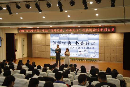 “演绎经典·书香致远” ——我校成功举行本学期经典阅读情景剧大赛2019年4月29日下午16:30,学保处在晖华楼小剧场隆重地举行了本学期“演绎经典·书香致远”经典阅读情景剧大赛。学校校监史文老师,校党委副书记、学保处处长曹云林老师,校党委宣传部部长齐砚奎老师,校党委组织部部长周凯波老师,学保处副处长刘洪伟老师,通识学院耿松老师,学校经典阅读总负责老师华芸,各二级学院党总支书记以及全体正副辅导员参加了本次活动。(图1:赛场主持)(图2:活动现场)首先,教育学院以莎士比亚笔下的《皆大欢喜》拉开了本次大赛的序幕。教育学院的同学们用生动的表演,展示出莎翁笔下的人间故事,在远2019-04-30 -