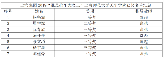 艺术设计学院参加上汽集团“谁是搞车大魔王”短视频大赛荣获佳绩由上汽集团和新浪微博共同举办的2019“谁是搞车大魔王”短视频大赛于2019年4月26日落下帷幕。大赛自4月1日开赛以来,总共200余组报名,共收到100多件参赛作品,分别来自上海各大高校,复旦大学、同济大学、交通大学、上海大学,老版新葡萄8883国际官网等。经过网络投票和专业评审的层层选拔,4月26日,10强选手齐聚上汽荣威智能广场,现场PK出最终大奖。我校艺术设计学院学生作品在本次比赛中脱颖而出,获得了一等奖一名,二等奖一名,三等奖五名的好成绩,成为此次比赛的最大赢家。具体名单如下:(图一:我校学生获奖名单汇总)艺2019-04-29 -