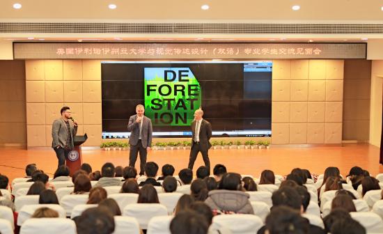 美国伊利诺伊州立大学来访我校2019年4月4日,美国伊利诺伊州立大学招生办主任JeffMavros、艺术系专业主任MichaelWille来访我校。我校校长叶才福、国际交流处处长胡珍、艺术设计学院副院长朱花、国际交流处副处长梁杰、院长助理兼视觉传达设计专业负责人包臻隽、视觉传达设计(双语)专业主任钟华勇热情接待,深入洽谈两校视觉传达设计专业国际合作交流事项及国际课程教学细节。上午10:30,外宾与2017级、2018级视觉传达设计(中美合作办学)专业121名学生见面。见面会视觉传达设计(双语)专业主任钟华勇及院长助理兼视觉传达设计专2019-04-09 -