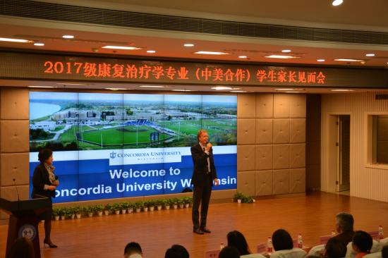 美国威斯康星协和大学来访我校2019年3月19日-21日,美国威斯康星协和大学来访,就我校健康学院2017级康复治疗学(中美合作)专业首批学生出国攻读双学位细节进行具体磋商与沟通,并与学生、家长面对面交流,细心解答现阶段问题。3月19日,2017级康复治疗学(中美合作)专业学生家长见面会于晖华楼小剧场顺利召开。威斯康星协和大学分管国际交流工作副校长Dr.DavidBirner,文理学院院长Dr.StevenRichardMontreal,康复治疗学专业主任Dr.TheodoreIKing,国际项目主任DamianWyman,国际项目2019-03-28 -