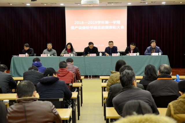我校资产设备处召开学期工作总结表彰大会2019年1月17日上午09:00,我校资产设备处在图书馆四楼报告厅隆重召开学期工作总结表彰大会。学校副校长朱国权,资产设备处处长朱清,副处长董海霞、周建文,图书馆馆长吴志荣,网络信息中心主任许晓洁,计算机教育技术中心主任孙敏凤和资产设备处全体教职工出席了大会。大会由资产设备处副处长周建文主持。(资产设备处条线学期工作总结暨表彰大会)会议首先由资产设备处副处长董海霞宣读了《2018—2019学年第一学期资产设备处“服务标兵”表彰决定》,曹彦磊、陈万卷、李小平、顾金龙被评为“服务标兵”,现场进行了颁奖。(董2019-01-18 -