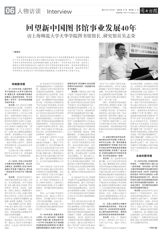 我校图书馆馆长吴志荣接受《图书馆报》专访伴随着改革开放的步伐,新中国图书馆事业走过了40年的繁荣发展期。2018-11-16 -