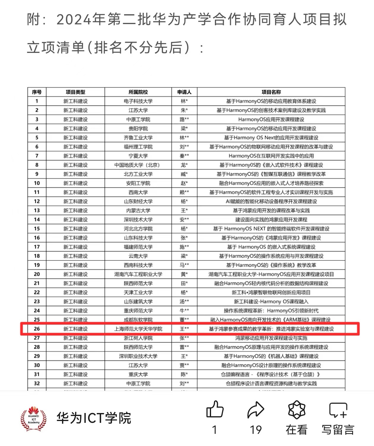 喜报 | 我校人工智能学院获2024年第二批“教育部华为产学合作协同育人项目”立项2024年10月26日,在遵循教育部关于产学合作协同育人项目管理办法及华为的评审流程指导下,华为携手高校教育专家对已通过初审的“2024年第二批华为产学合作协同育人项目”进行了严格的立项评审。此次评审采用线上与线下相结合的方式进行,共有75个项目通过了专家组的综合评审。中标单位多数为985/211高校及双一流大学,竞争异常激烈。我校人工智能学院王晓波团队提交的《基于鸿蒙参赛成果的教学革新——鸿蒙实验室和课程建设》项目,在众多优秀项目中脱颖而出,成功立项。教育部与华为合作的协同育人项目,通过产教融合推动新工科建设,利用华为的前沿技术和教育资源,助力高校更新教学内容、改革课程体系,并提升教师专业能力,旨在培养适应新时代需求的高质量工程技术人才,增强学生的实践经验和就业竞争力在本次项目申报中,经专家评审,45个项目进入答辩环节,最终30个《HarmonyOS》新工科项目获立项。上海市有一个项目成功入选,即我校人工智能学院的项目。该项目聚焦HarmonyOS技术,通过校企合作将其融入教学体系,旨在培养适应未来分布式应用开发的高素质人才,推动新工科建设,促进信息技术产业创新发展。2024-11-11 -