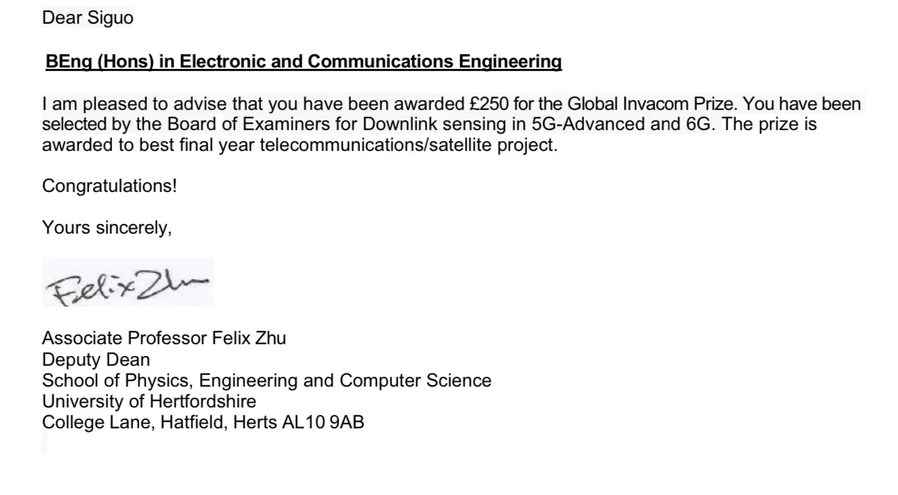 人工智能学院许思果同学荣获英国赫特福德大学优秀毕业设计奖近日,学校人工智能学院2020级电子信息工程专业许思果同学的毕业设计荣获英国赫特福德大学(University of Hertfordshire,简称UH)优秀毕业设计奖Global Invacom Prize。(英国赫特福德大学的获奖通知邮件)许思果同学参加我校与英国赫特福德大学的国际课程合作项目,于2023年前往英国就读本科的第四年,并完成本科毕业设计。优秀毕业设计奖的颁发者Global Invacom Group是一家国际通信集团公司,与众多国际知名高校合作,还设立学生奖励机制,从中选拔优秀通信类毕业生。许思果同学的毕业设计能够在众多工程类毕业设计中脱颖而出,离不开许思果同学的努力钻研,也倾注了母校老师们的关心与帮助。这是学校人工智能学院的学生首次获得该奖项,是对我校国际化办学成果的一次有力证明。学校一直致力于为学生提供广阔的国际视野和多元化的学习机会,通过提供各类国际化平台和资源,促进师生与国际先进教育理念和技术的交流与融合。人工智能学院为师生开展各种合作与交流活动,不断加深对海外高校与学术现状的了解,激发学习兴趣,强化专业技能,为有意愿前往海外留学的同学们搭建桥梁。2024-08-27