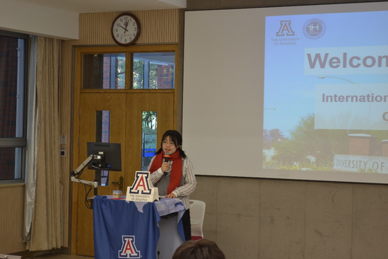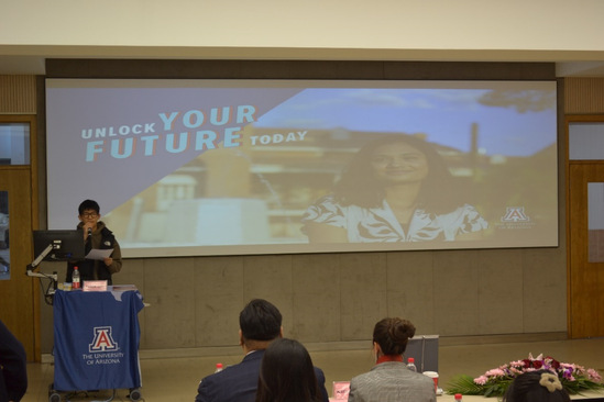 我校与美国亚利桑那大学共建硕士项目1111MicrosoftInternetExplorer402DocumentNotSpecified7.8 磅Normal02023年我校与美国亚利桑那大学建立合作关系。12月1日,亚利桑那大学(The University of Arizona,UA)国际录取招生主任Katie Van Wyk、中国中心主任Peter Zhang来我校洽谈两校合作的经济学硕士项目。我校国际交流处处长胡珍等接待来访。随后UA代表莅临商学院,与商学院的众多学子见面。我校商学院副院长蒋亚萍及国际商务(国际课程合作)专业负责人孙艳艳出席项目介绍会,会议由国际交流处钱奕淳老师主持。(图片一:国际交流处钱奕淳老师主持)宣讲会开始,商学院副院长蒋亚萍代表商学院致辞,对两位院校代表的来访致以热烈的欢迎,希望此次洽谈的经济学硕士项目给天华学子带来更好机会,鼓励同学们要抓住机遇,努力提升自己获得更美好的未来。(图片二:蒋亚萍副院长致辞)亚利桑那大学国际录取招生主任Katie Van Wyk重点介绍了学校。亚利桑那大学师资力量雄厚,在校教师曾5次获得诺贝尔奖、153次评为美国国家院士和美国科学院院士,目前,在校生超过52023-12-06 -