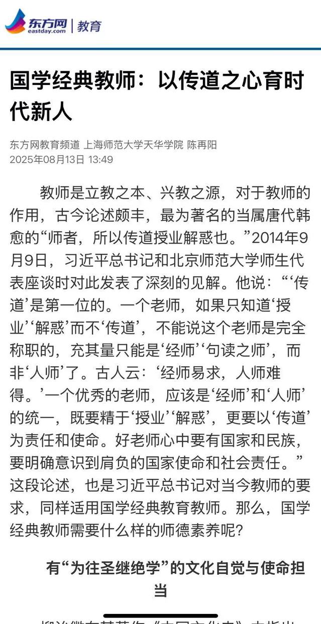东方网 | 陈再阳:以传道之心育时代新人来源:东方网 2025年8月13日标题:国学经典教师:以传道之心育时代新人作者:陈再阳教师是立教之本、兴教之源,对于教师的作用,古今论述颇丰,最为著名的当属唐代韩愈的“师者,所以传道授业解惑也。”2014年9月9日,习近平总书记和北京师范大学师生代表座谈时对此发表了深刻的见解。他说:“‘传道’是第一位的。一个老师,如果只知道‘授业’‘解惑’而不‘传道’,不能说这个老师是完全称职的,充其量只能是‘经师’‘句读之师’,而非‘人师’了。古人云:‘经师易求,人师难得。’一个优秀的老师,应该是‘经师’和‘人师’的统一,既要精于‘授业’‘解惑’,更要以‘传道’为责任和使命。好老师心中要有国家和民族,要明确意识到肩负的国家使命和社会责任。”这段论述,也是习近平总书记对当今教师的要求,同样适用国学经典教育教师。那么,国学经典教师需要什么样的师德素养呢?有“为往圣继绝学”的文化自觉与使命担当柳诒徵在其著作《中国文化史》中指出:“孔子者,中国文化之中心也。无孔子则无中国文化。自孔子以前数千年之文化,赖孔子而传;自孔子以后数千年之文化,赖孔子而开。”孔子对古代文化的热爱和传承的使命感在《论语》中有多次陈述,2025-08-13 -