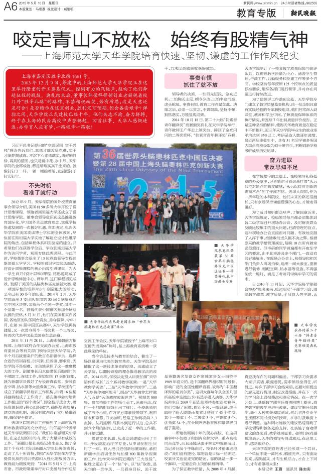 新民晚报:教学之本在课堂——天华学院“活力课堂”教学改革2016年12月29日,新民晚报刊发社评《教学之本在课堂》,报道我校“活力课堂”教学改革,以下是社评原文:写下这个题目,至少有两层意思。一,虽然新年已进入倒计时,但怎么说都离寒假还有时日。几乎每年此时,网上都会出现“史上最长高校寒假排行榜”,2017年的榜单也早已出笼,最长的放假58天,最短的放假44天。如果对比一下中小学区区20多天的寒假,大学够幸福的了。二,2017年我国的大学本科生恐怕要“收骨头”了。教育部副部长林蕙青日前已吹风,即将颁布实施全部92个本科专业类的教学质量标准,作为本科人才培养质量的2016-12-29 -