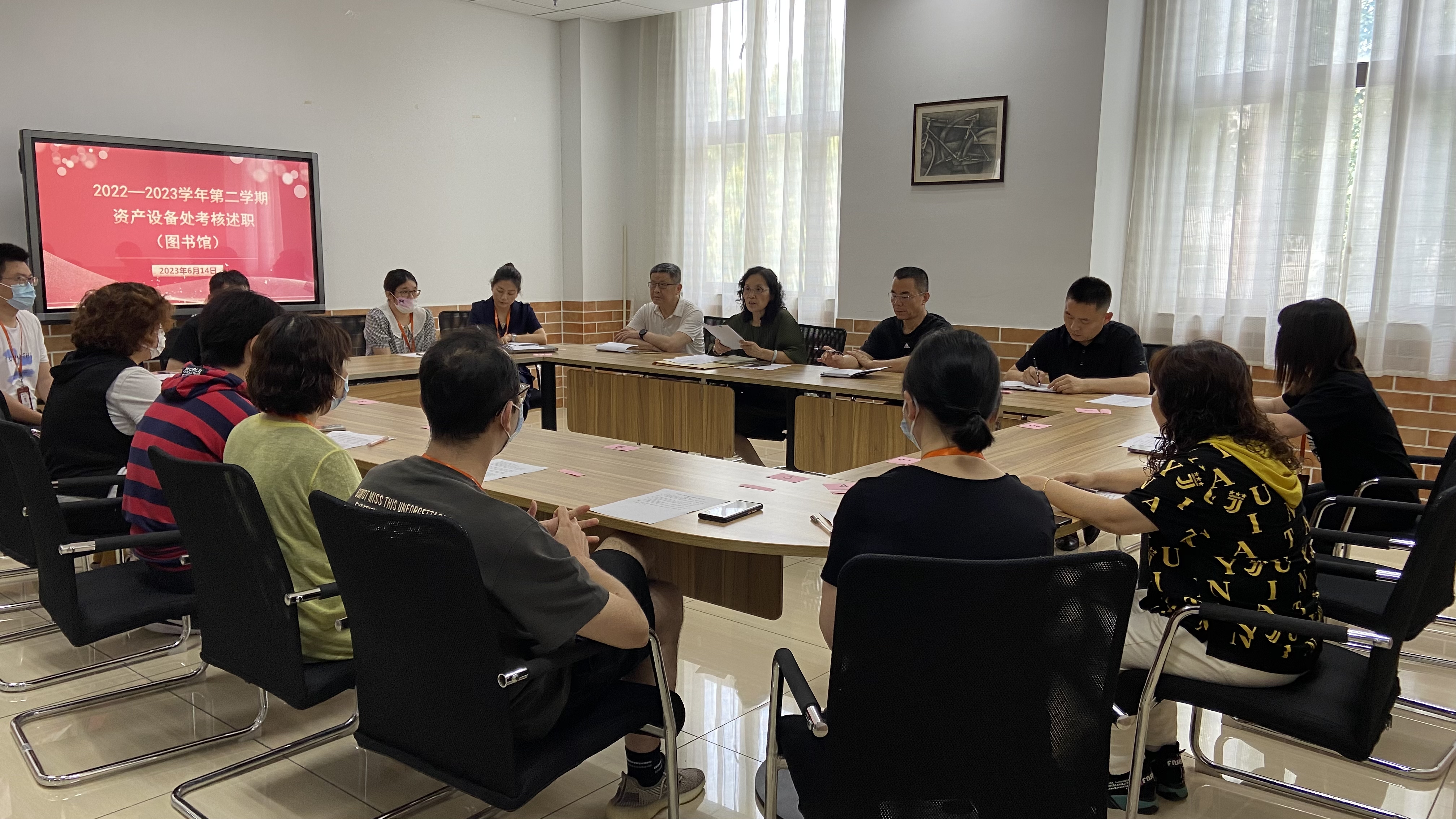 2023年6月13日、14日,资产设备处依照学校统一要求,组织开展学期考核述职,资产设备处处长朱清,副处长董海霞、周建文全程参与并组织了考核。考核述职按照图书馆、车队、资产与场所管理条线分别组织实施。