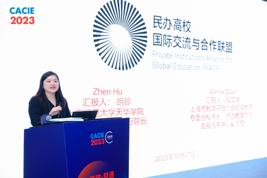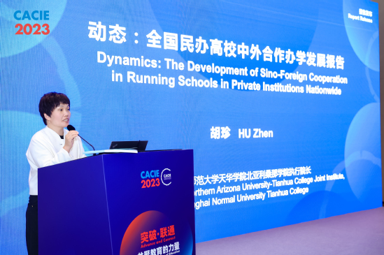 接下来是我校国际交流处处长胡珍在论坛上发布分享了《全国民办高校中外合作办学发展报告》。该报告是对全国面上所有民办本科和高职院校做的调研,包括政策解析、实施路径、数据分析和案例分析,尤其是数据分析部分引起了与会同仁的广泛关注。