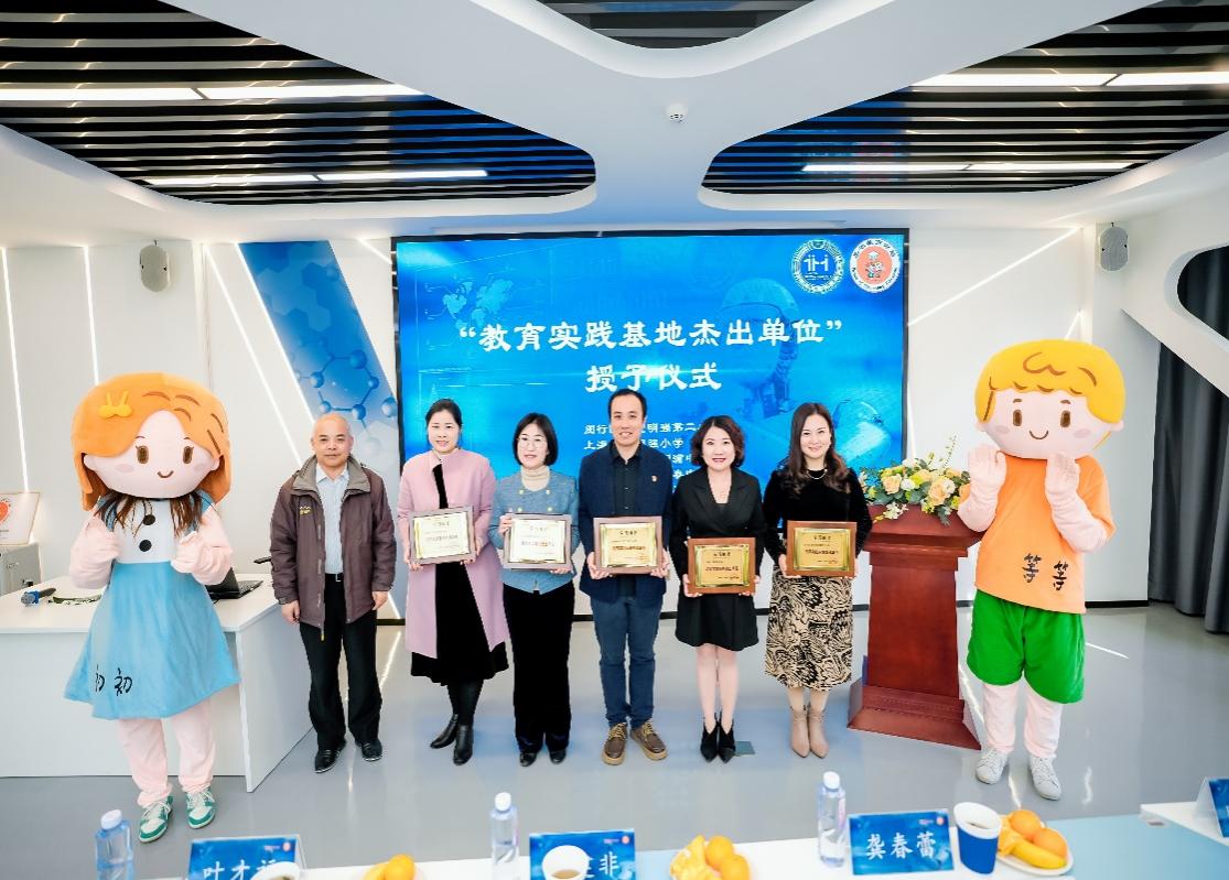 老版新葡萄8883国际官网校长叶才福为闵行区七宝明强第二小学、上海七宝明强小学、上海市宝山区月浦中心校、上海市普陀区朝春中心小学和嘉定青少年科创集散地颁发“教育实践基地杰出单位”荣誉称号。